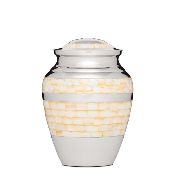 This handmade Mother of Pearl cremation urn is very well made and heavy in weight. Mother of Pearl tiles are inlaid on the body and lid. Banding of silver nickel plating on the body and neck of the urn.
